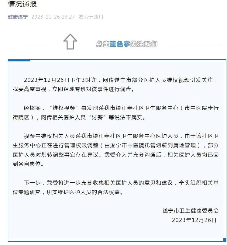 2023年12月26日下午3时许,网传遂宁市部分医护人员维权视频引发关注,我委高度重视,立即组成专班对该事件进行调查。