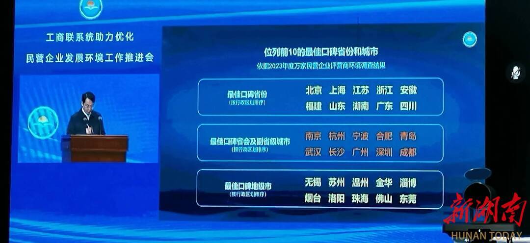 湖南日报12月27日讯(全媒体记者 唐亚新)27日下午,全国工商联在云南省昆明市召开会议并发布2023年度“万家民营企业评营商环境”主要调查结论。湖南获评营商环境“前10省份”和“前10最佳口碑省份”;长沙获评营商环境“前10省会及副省级城市”和“前10最佳口碑省会及副省级城市”。