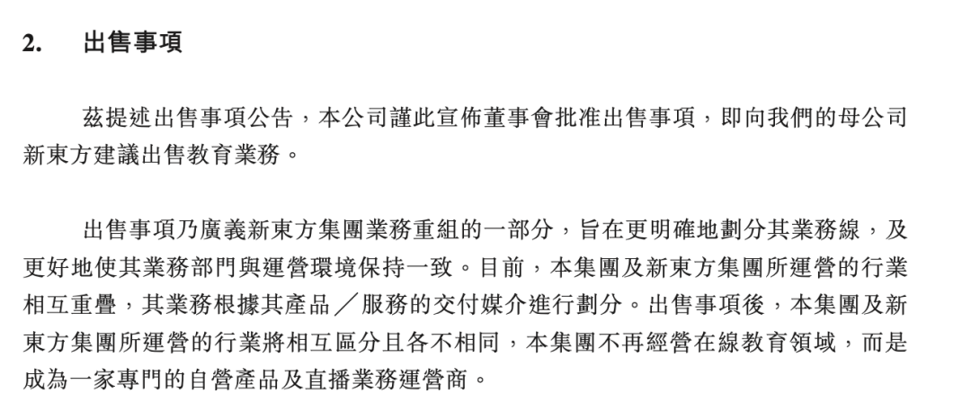 出售事项后,集团及新东方集团所运营的行业将相互区分且各不相同。集团将不再经营在线教育领域,而是成为一家专门的自营产品及直播电商业务运营商。
