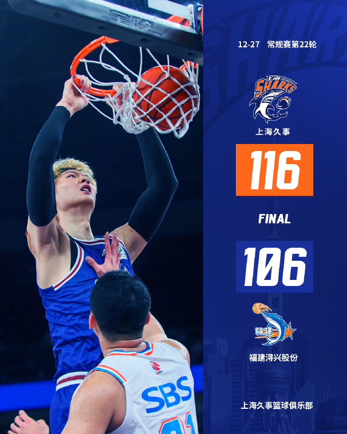 27日晚,CBA常规赛第22轮,上海男篮在主场以116比106击败福建男篮。