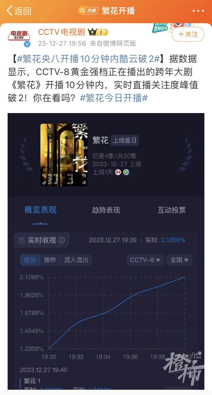 从筹备到开机、从杀青到开播,一直备受关注的《繁花》在央视八套开播仅10分钟,收视率就破了2。微博热搜榜上,相关话题词就占了7个!作为全网独播的视频平台,腾讯直接给了一个大专题,分普通话版和上海话版两个版本播出,全部首页置顶推荐,给足了排面。