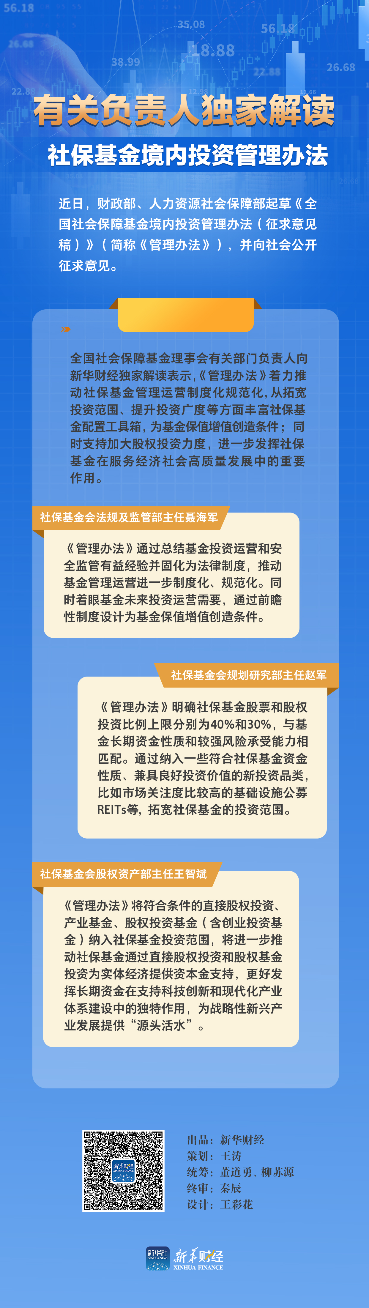 《管理办法》有何看点?会对社保基金投资运营带来哪些影响?近日,全国社会保障基金理事会有关部门负责人表示,《管理办法》着力推动社保基金管理运营制度化规范化,从拓宽投资范围、提升投资广度等方面丰富社保基金配置工具箱,为基金保值增值创造条件;同时支持加大股权投资力度,进一步发挥社保基金在服务经济社会高质量发展中的重要作用。