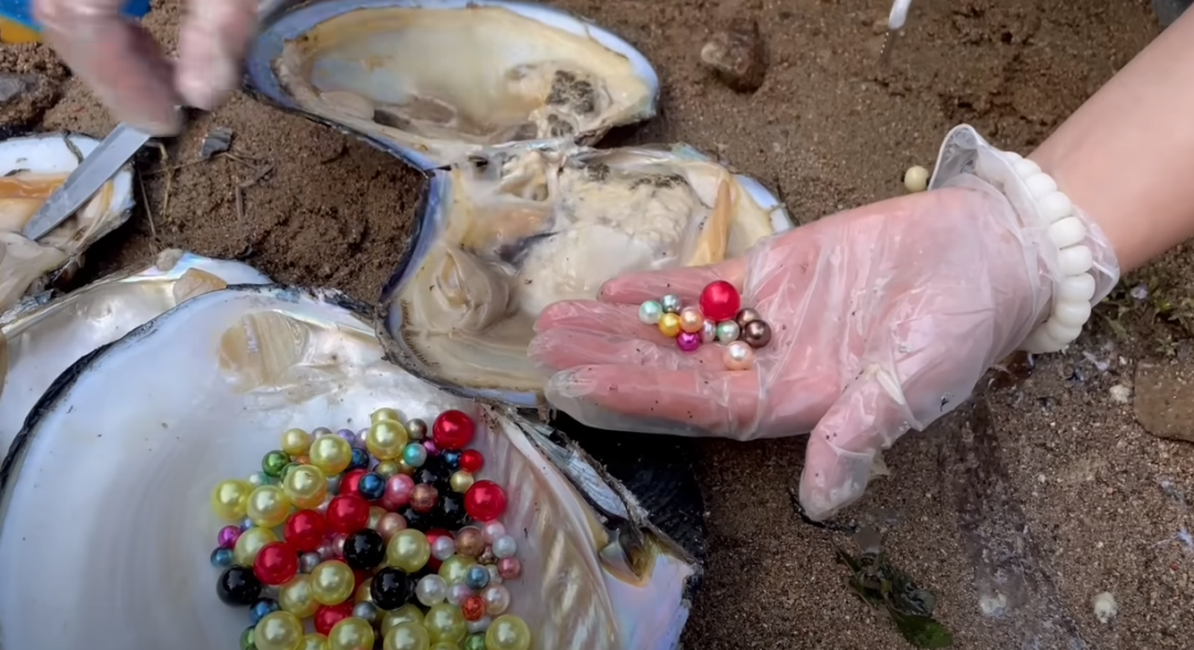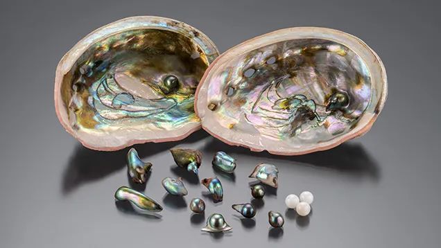 第一代白金汉公爵乔治·维利尔斯佩戴珍珠 图源:wikipedia有与贝壳完全分离的“游离珍珠”,也有附着在贝壳上的“贝附珍珠”。还有一些洞穴里也会出现像珍珠一样圆滚滚的石头,也是碳酸钙围绕沙粒生长而成。只不过这一过程中没有生命的参与,和钟乳石的生长类似,只是矿物从溶液中不断结晶出来的产物。在我国云贵地区的溶洞里就可以看到许多这样的洞穴“珍珠”。波斯湾的天然珍珠从两千年前就已经被人们所发现采集,占据巴黎天然珍珠销售中心半数以上的量。颜色为白色、乳白色,光泽强、颗粒大、品质优,尤其以巴林岛附近珍珠最佳。中国广西合浦的马氏珠母贝所产的天然珍珠,光泽圆润,颗粒较大,从皇家贡品到丝路佳品,都有它的身影。生产珍珠并不是双壳纲的贝蚌类生物的特权,还有一些来自腹足纲的海螺、鲍贝生物体内也可以形成类似珍珠的物质。没错吃鲍鱼也可能会吃出珍珠(虽然概率极小🤫)图源:gia.edu比如,美洲加利福尼亚、佛罗里达和西印度群岛的近海地区,有一种女王凤凰螺,生产的女王凤凰螺珍珠,平均 2 万个才会出现 1 个优质珍珠,从螺到珠都是芭比粉色系,可以看到火焰一样漂亮的纹理!东南亚到澳大利亚的近海地区,有一种椰子涡螺,生产的美乐珠,最大能长到高尔夫球大小!从螺到珠都是木瓜橙色系,纹理有的像火焰,有的像星点。木瓜橙色的椰子涡螺和美乐珠 图源:wikipedia此外,还有产于美国近海的天王赤旋螺珍珠,西印度洋和西太平洋的角赤螺旋珍珠、纺锤螺珍珠、鲍贝珍珠等等。右边三颗为鲍贝珍珠,你能认出来这是珍珠么?图源:wikipedia除了这些珍贵的天然珍珠,还有许多好看的人工养殖珍珠。中国长江中下游地区的淡水养殖珍珠,日本濑户内海的海水养殖珍珠,波利尼西亚大溪地的黑色珍珠,南太平洋的金色珍珠。人工养殖珍珠产量很大、价格较低,已经占据了珍珠的大部分市场。介绍完上面的珍珠,你可能就发现了,大家平时吃的海鲜种类和生产珍珠的海鲜种类不太一样,即使种类一样里面有珍珠的也很少,从海鲜中吃到珍珠的概率堪比中彩票!甚至有时就算你吃到了,都没认出来那是珍珠(摊手)。先猜猜这是真的假的?图源:YouTube上一个播放量过千万的视频讲完了真珠,我们再来看看假珠。要鉴别真假珍珠,首先要知道如何仿制珍珠,常见的珍珠仿品,由玻璃、塑料、贝壳等材质做成。