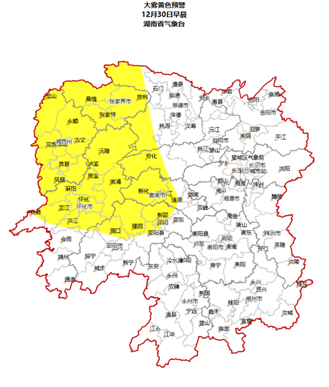 湖南省气象台12月29日16时发布大雾黄色预警:预计30日早晨邵阳北部、常德西部、张家界、益阳西南部、怀化、娄底西部、湘西州将出现能见度≤500米的雾,且有成片≤200米的雾,部分地区将出现强浓雾,能见度低,将对交通运输造成较大的影响。