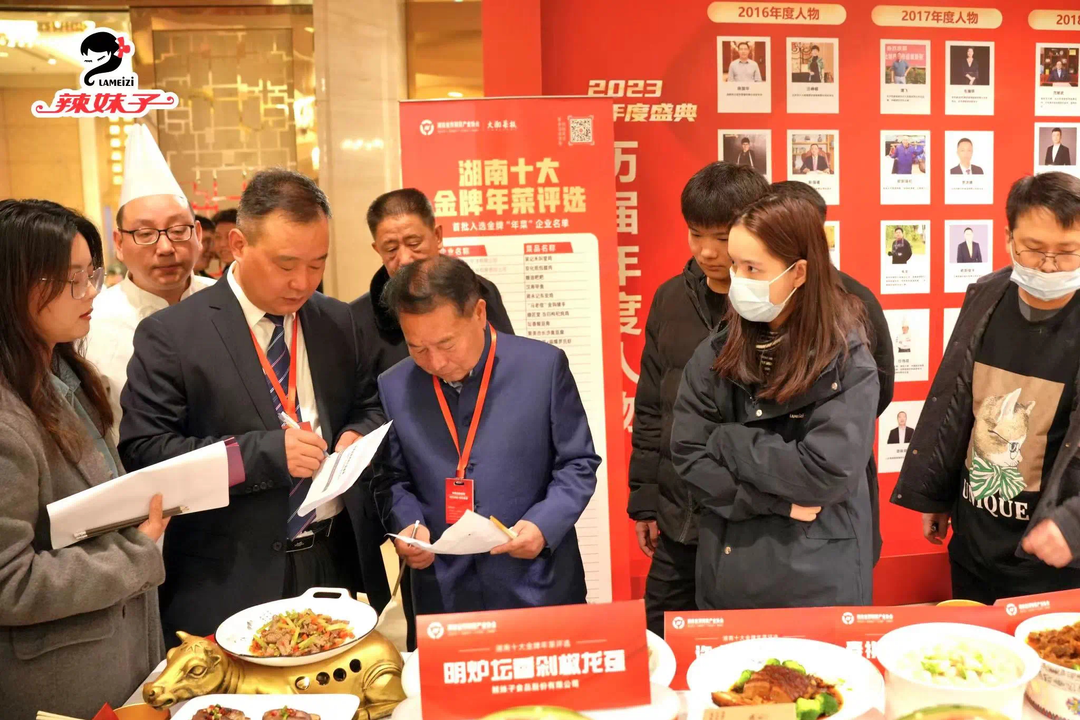 “口感真的很赞!”“年货选品就这个了!”在湖南十大金牌年菜评选现场,热闹非凡,参赛作品琳琅满目,香味四溢。全省100多款年菜产品火热参评,30多家企业参赛入围。最终,辣妹子品牌推选的明炉坛香剁椒龙趸等十道菜品荣获 2023“年度十大金牌年菜”。明炉坛香剁椒龙趸这道菜品以辣妹子今年重磅新品剁椒辣酱为主要调味料烹饪而成。“这款剁椒辣酱味鲜辣爽。”现场评委们对此给出了高度评价。