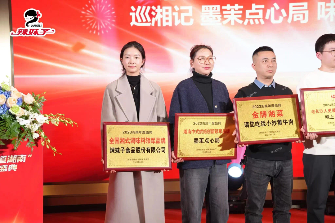 近年来, 湘菜以17.6%的市场占有率跃居八大菜系之首,其独特的口味和丰富的文化内涵吸引了全国乃至全球的食客,这浓墨重彩的一笔离不开复合调味品的巧妙运用。在本次盛典上,颁布了2023“年度湘菜品牌”评选榜单,辣妹子获评“全国湘式调味料领军品牌” 奖项。