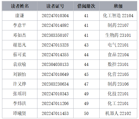 为营造浓厚的读书氛围,培养学生良好的读书习惯,倡导读书明理、读书求知、读书成才新风尚。近日,湖南化工职业技术学院图书档案馆对在校师生借阅数据进行统计分析,评选出2023年度“十佳校园阅读达人”。