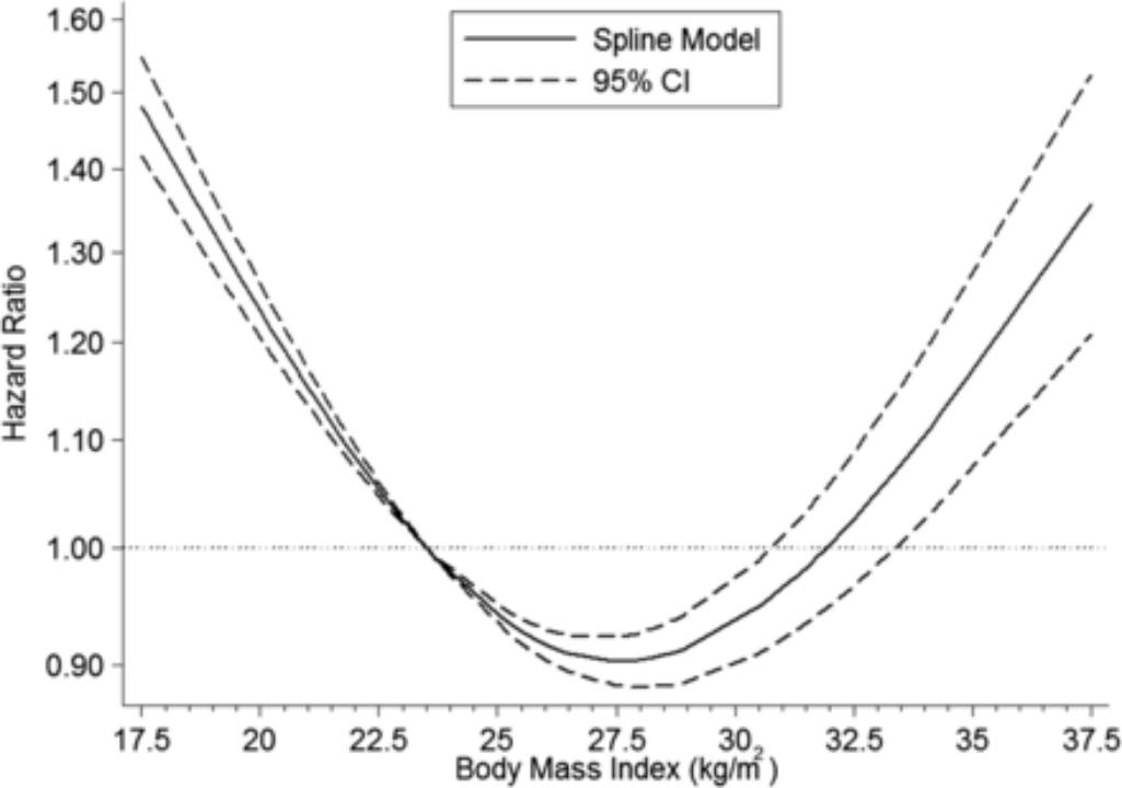 老年人太胖或太瘦都不好。2014 年美国临床营养学杂志上刊登的一篇荟萃分析发现,老年人的 BMI 与死亡率之间存在 U 型关系,在曲线的两端——也就是 BMI 范围很低或很高都会增加死亡风险[10]。