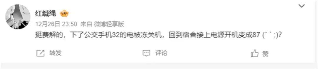 除了被冻关机外,还有许多网友反映,手机还出现了电量迅速减少的情况。网友“红碱绳”说,“挺费解的,下了公交车,手机32%的电被冻关机。回到宿舍,接上电源开机变成87%。”
