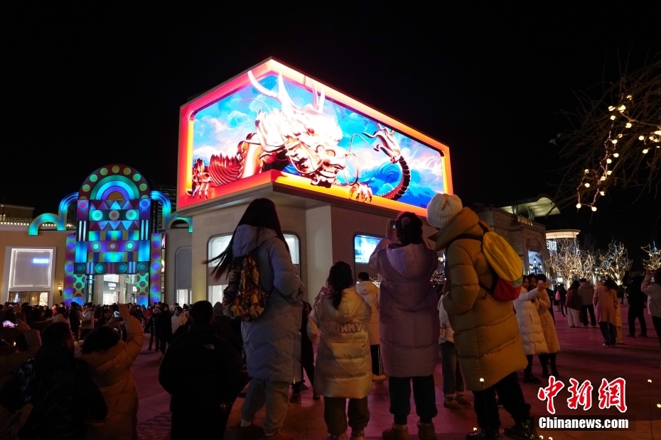 2023年12月31日,北京蓝色港湾商务区新年气氛浓,不少市民、游客齐聚于此,共同迎接2024新年的到来。图为2024年蓝色港湾“龙元素”吸引民众拍照。