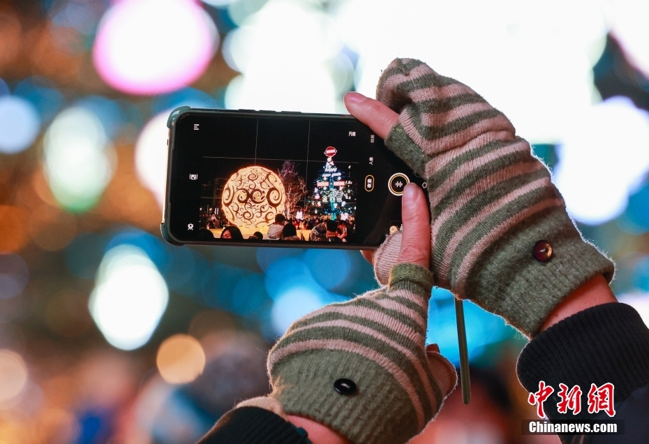 2023年12月31日晚,北京一热门商圈客流众多,市民在一处灯光艺术装置前拍照。