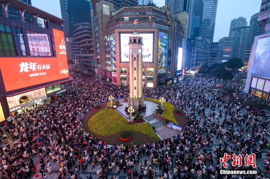 2023年12月31日,重庆解放碑步行街新年气氛浓,不少市民、游客齐聚于此,共同迎接2024新年的到来。