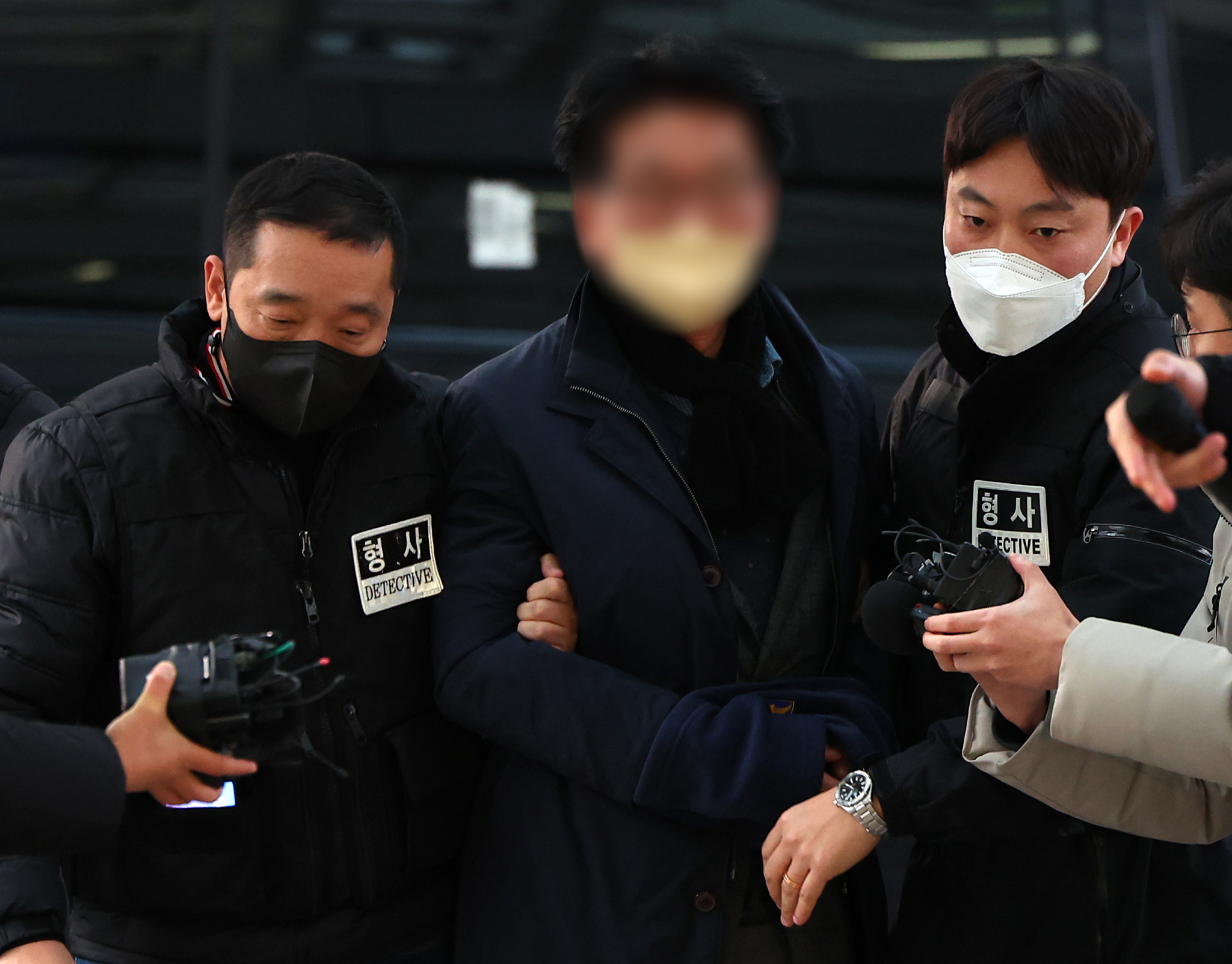当地时间2024年1月2日,韩国釜山,嫌疑人被送往警察署。澎湃影像 图