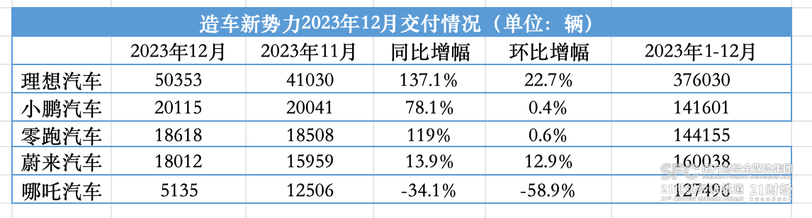 造车新势力方面,12月,今年以来稳坐造车新势力月度销冠的理想汽车月销首破5万辆,小鹏汽车、零跑汽车与11月差距不大;蔚来汽车较上月出现微增,依旧未能实现创始人称“每月销量稳定在2万辆以上”;哪吒汽车成为五家中唯一同环比出现下滑的车企,交付量仅5000余辆,已连续五个月垫底。