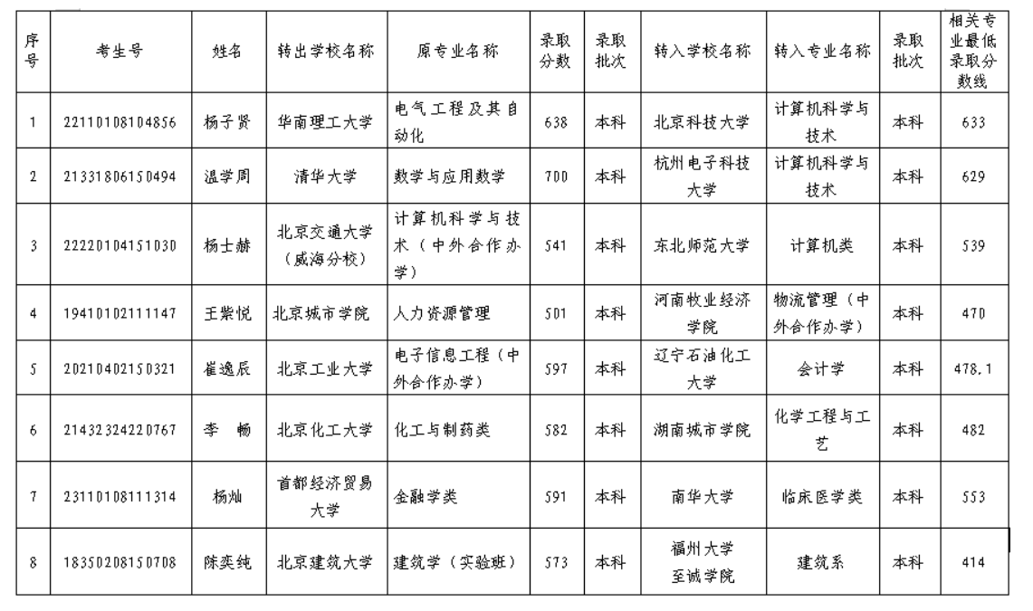 根据《北京市教育委员会关于做好普通高等学校学生转学工作的实施意见》规定,北京市教委对各高校报送的学生跨省转学材料进行了初审、复核,将这8名学生拟转学情况予以公示,公示期自1月2日起至8日结束,为5个工作日。公示期内,如对拟转学学生有异议,可以书面形式提出。