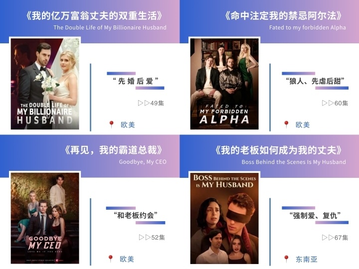 总的来说,以爱情为主线的言情题材在各个区域都适用。除了豪门继承人、CEO等普适性题材,细分来看,欧美观众爱看狼人、吸血鬼等高戏剧性、高视觉冲击类题材;东南亚市场,苦情虐恋、强制爱等题材更受欢迎。本质上,内核都是国内流行了多年的“霸道总裁爱上我”的套路。