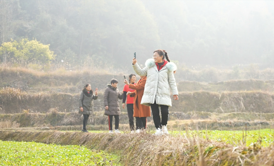 水岭乡枧田村村民刘春姣说:“以前我在家里带小孩、喂猪,很辛苦的,现在生活条件好了,每天跳跳舞、拍拍视频、发发抖音。这在以前这样地想都不敢想。”