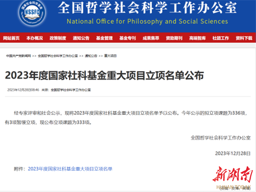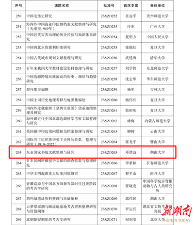湖南日报·新湖南客户端1月5日讯(通讯员 熊欢欢 记者 胡雪怡)近日,2023年度国家社科基金重大项目立项名单公布。湖南大学岳麓书院历史系教授、中国书院研究中心主任、中国书院学会副会长邓洪波申报的“东亚国家书院文献整理与研究”获批国家社科基金重大项目,是继2015年“中国书院文献整理与研究”获得国家级立项之后,再次入选立项名单。
