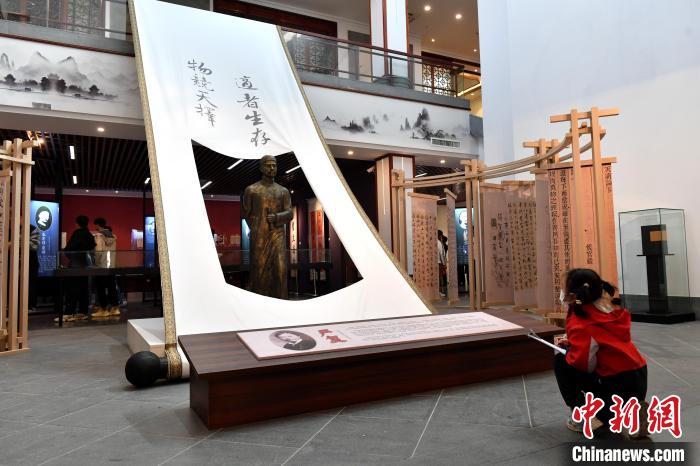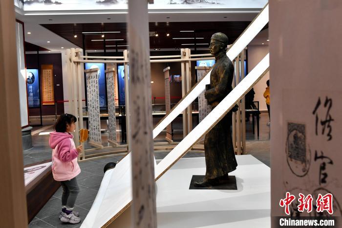图为小朋友在展览现场素描严复雕像。中新网记者吕明 摄