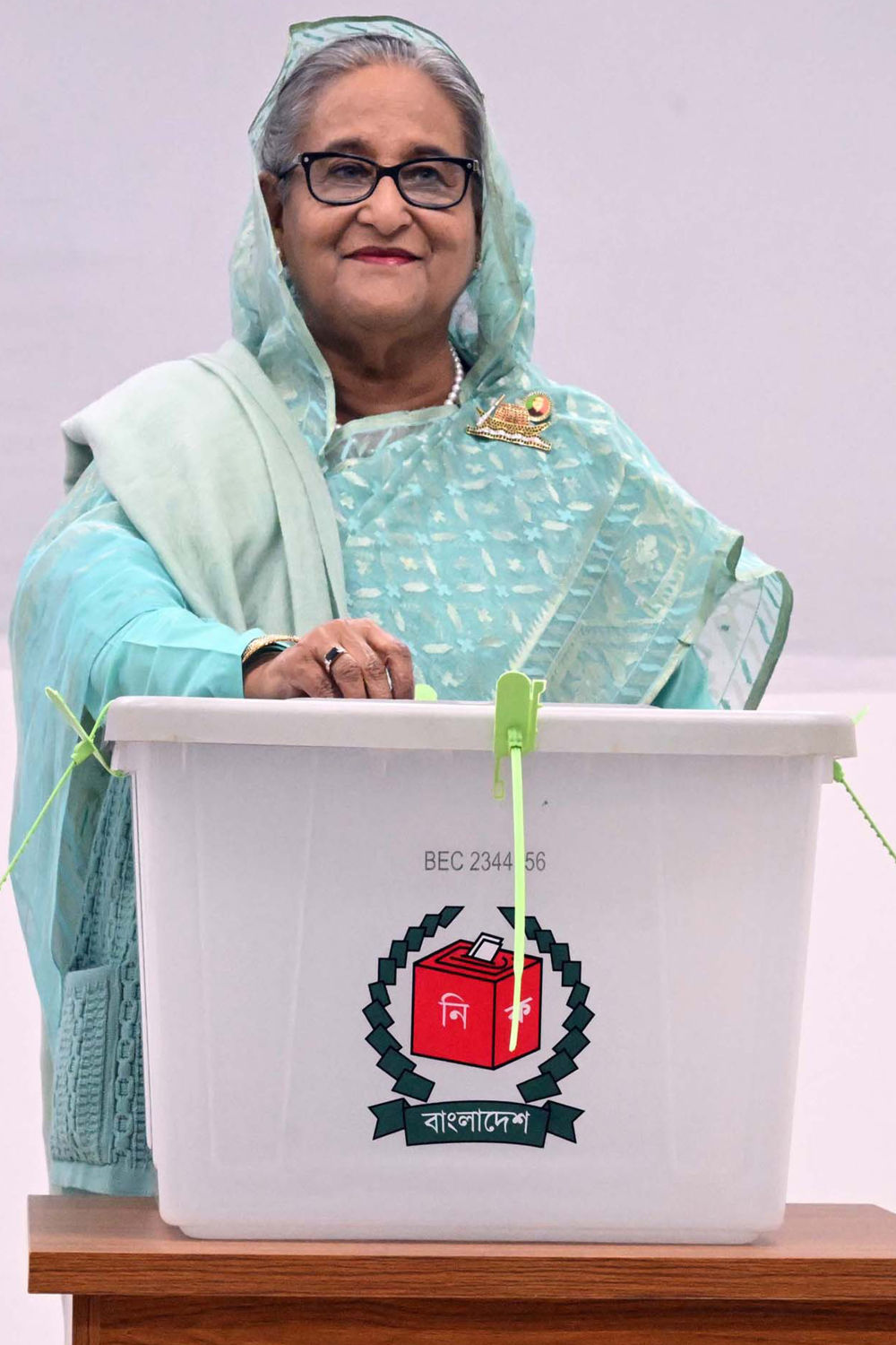 ↑1月7日,在孟加拉国达卡的一个投票中心,孟加拉国总理哈西娜在投票。
