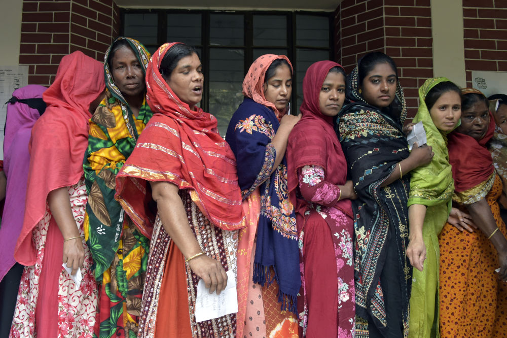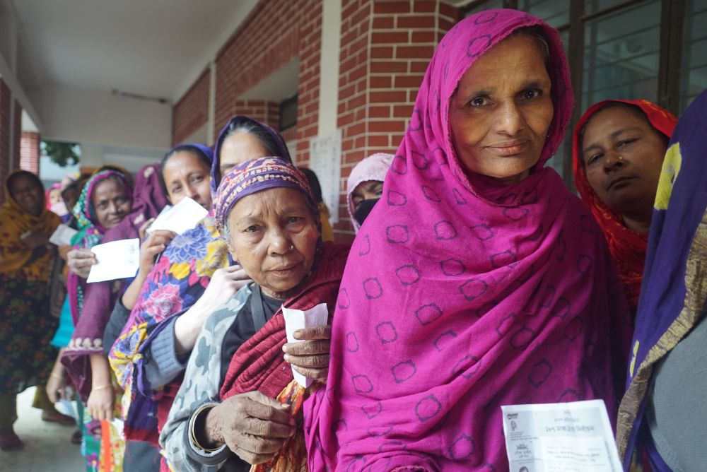 ↑1月7日,在孟加拉国达卡的一个投票中心,人们排队等候投票。