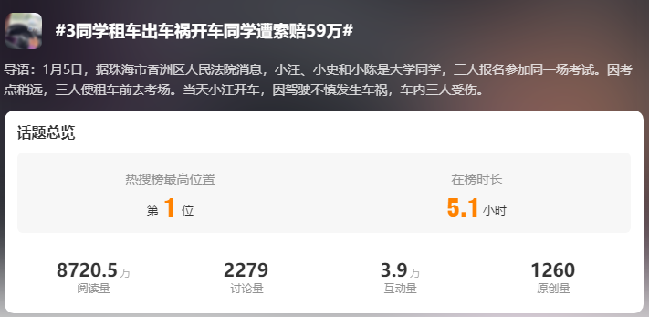 1月7日,话题词#3同学租车出车祸开车同学遭索赔59万#,冲上热搜第一。