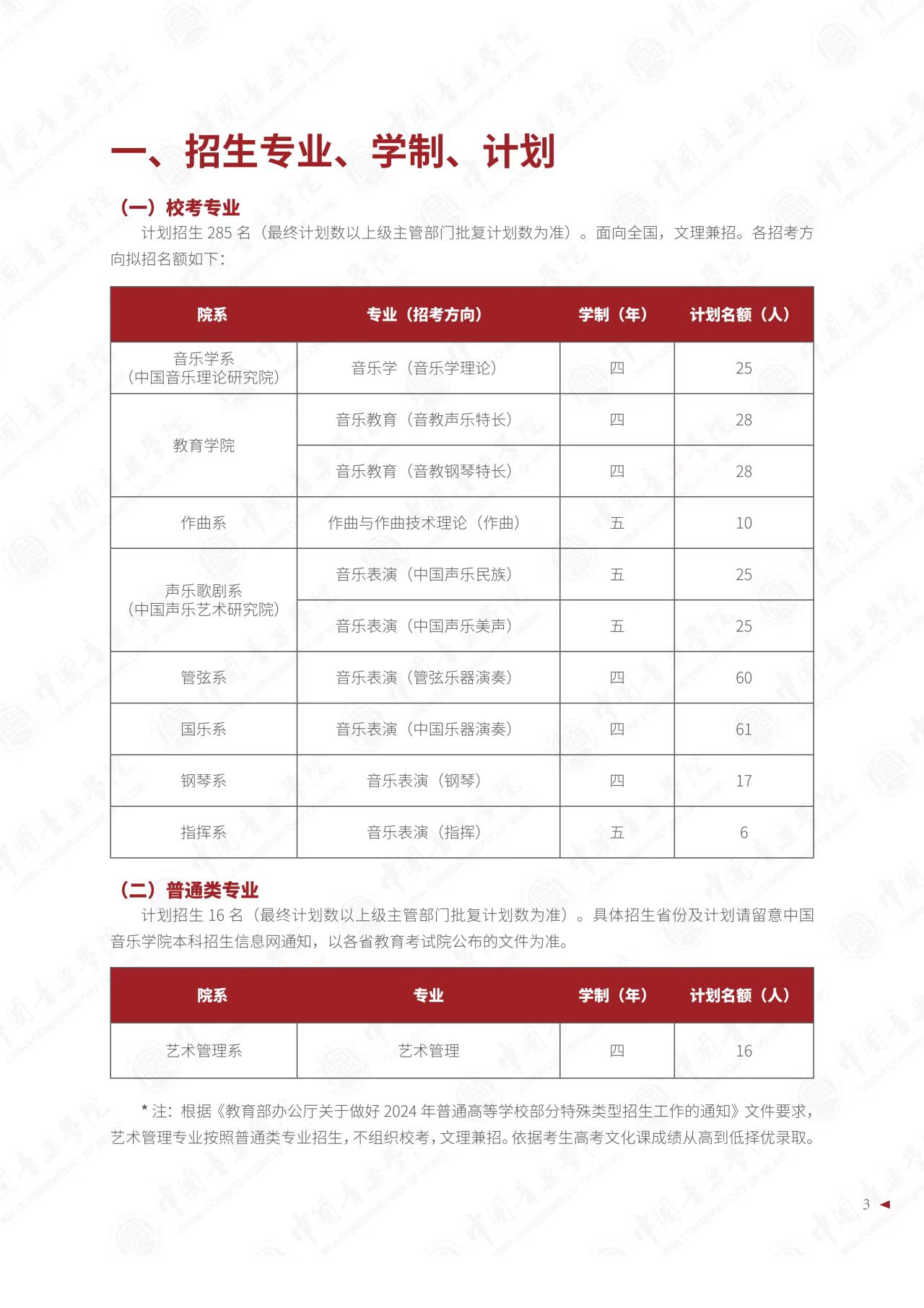 1月7日,中国音乐学院发布2024年本科招生简章,该校校考专业计划招生285名,包括音乐学(音乐学理论)、音乐教育、作曲与作曲技术理论、音乐表演(中国声乐民族)、音乐表演(中国声乐美声)、音乐表演(管弦乐器演奏)等10个专业。