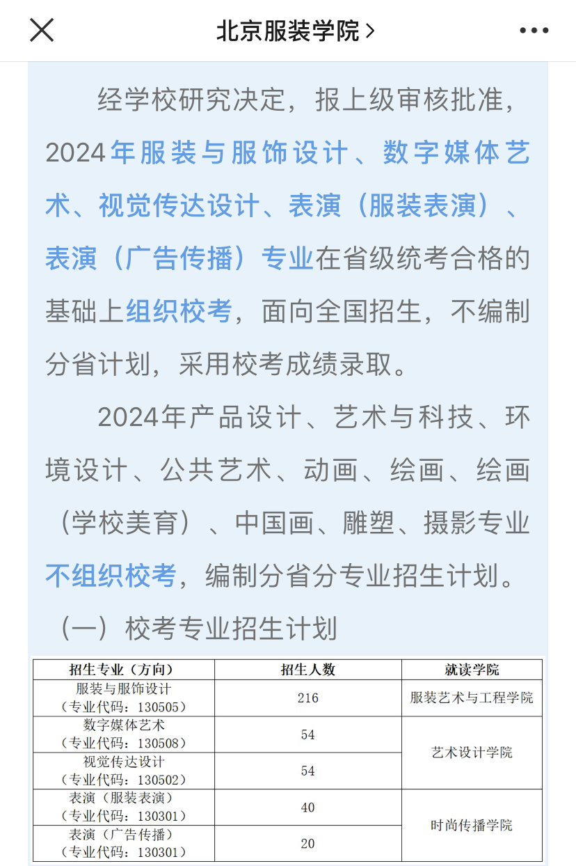 1月7日,北京服装学院发布2024年艺术类本科专业招生简章。该校在2024年服装与服饰设计、数字媒体艺术、视觉传达设计、表演(服装表演)、表演(广告传播)专业在省级统考合格的基础上组织校考,面向全国招生,不编制分省计划,采用校考成绩录取。另有产品设计、艺术与科技、环境设计、公共艺术、动画、绘画、绘画(学校美育)、中国画、雕塑、摄影专业不组织校考,编制分省分专业招生计划。