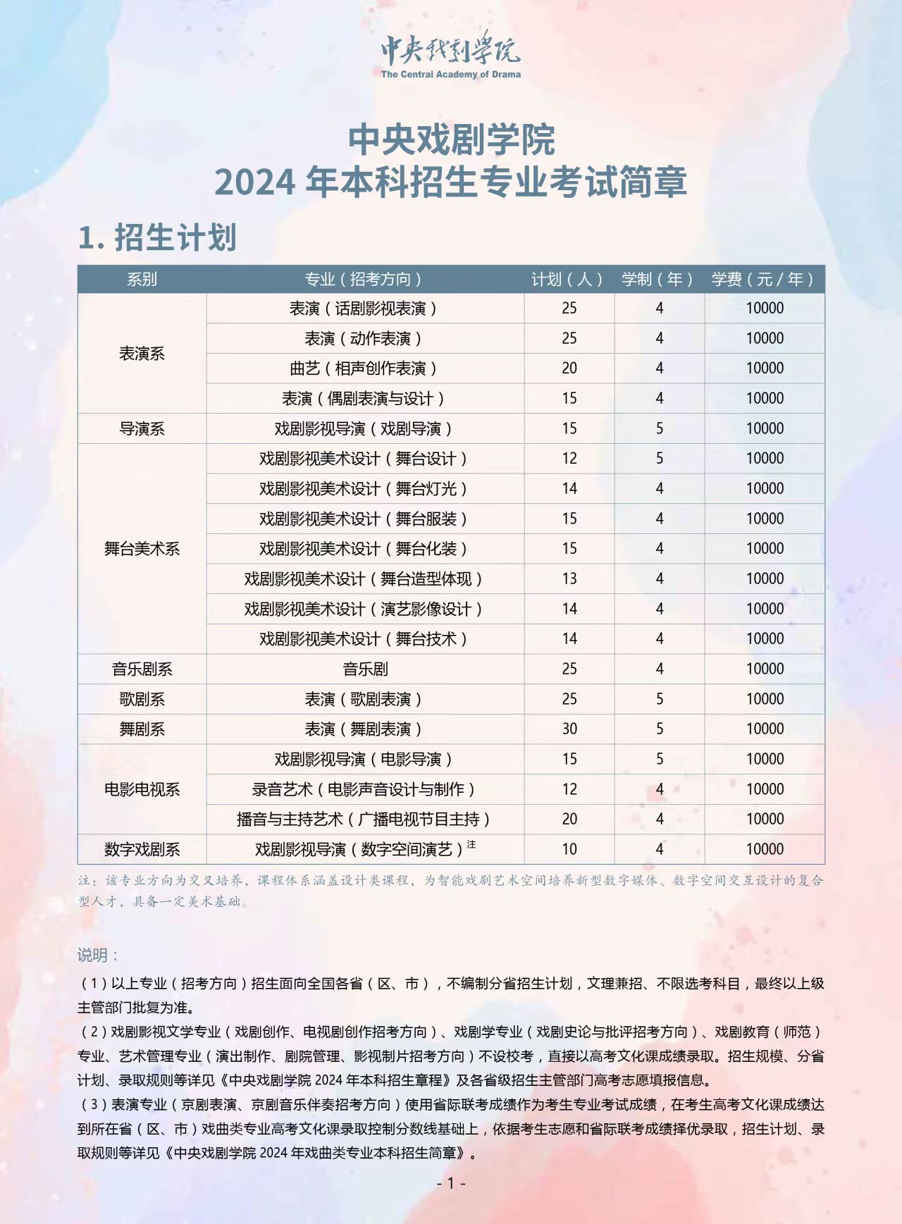 1月9日,中央戏剧学院发布2024年本科招生专业考试简章。该校将在表演、曲艺、戏剧影视导演、音乐剧等19个专业(招考方向)进行校考,面向全国各省(区、市),不编制分省招生计划,文理兼招、不限选考科目。
