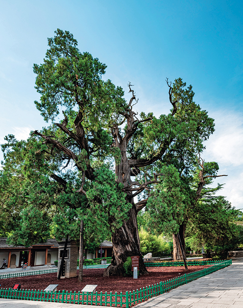 保生柏离黄帝手植柏不远,位于轩辕庙西前院保生宫旧址。它是元代保生宫火毁后的唯一“幸存者”。其树体纹理斑驳,诉说沧桑之变,枝干遒劲,彰显生机活力。