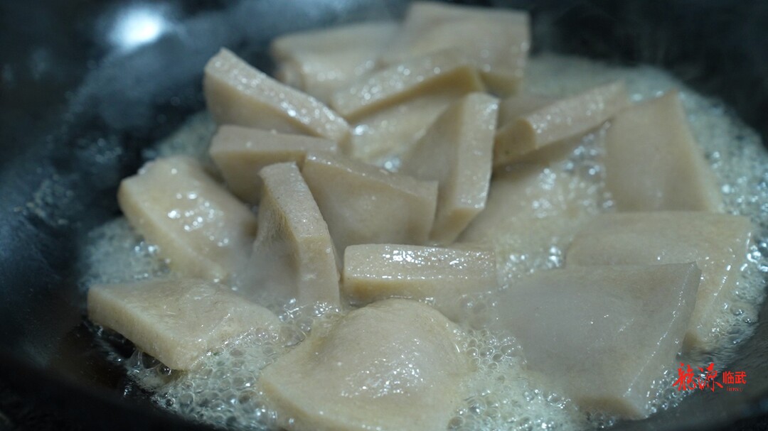 “我们这边都喜欢魔芋酿冬笋豆腐,放一点冬笋进去,口感比较脆,又甜,拌匀一下,再放点葱花进去,用热油炸一下。”魔芋酿豆腐收口后加水煮盖上锅盖,焖上10分钟,盛出备用即可。