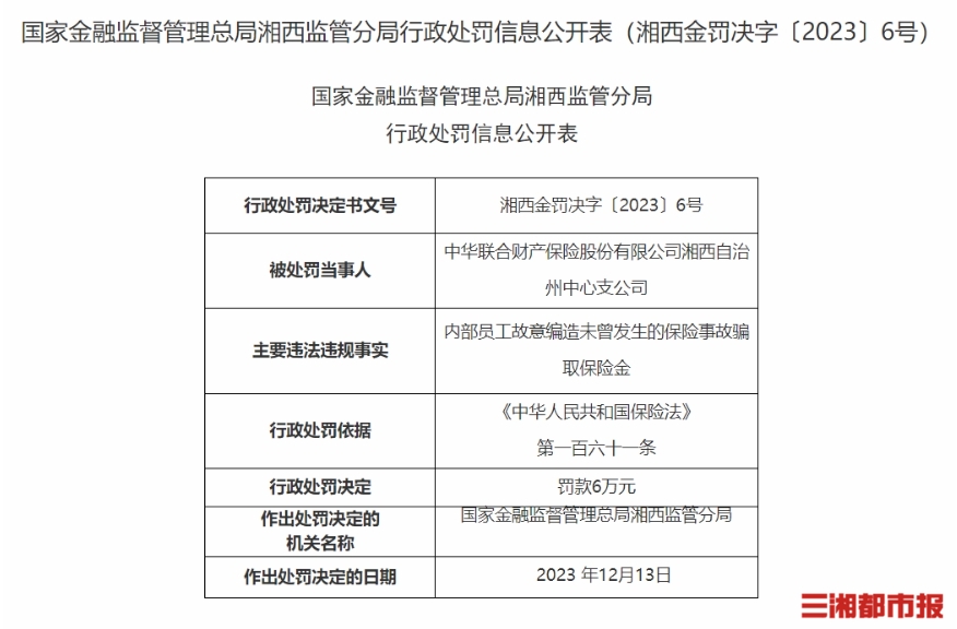 三湘都市报·新湖南客户端1月11日讯(全媒体记者 潘显璇)国家金融监督管理总局湘西监管分局近日公布的行政处罚信息显示,中华联合财产保险股份有限公司湘西自治州中心支公司,因内部员工故意编造未曾发生的保险事故骗取保险金,被罚款6万元。