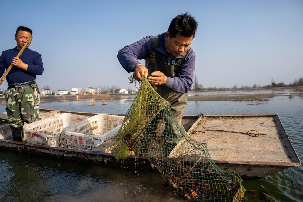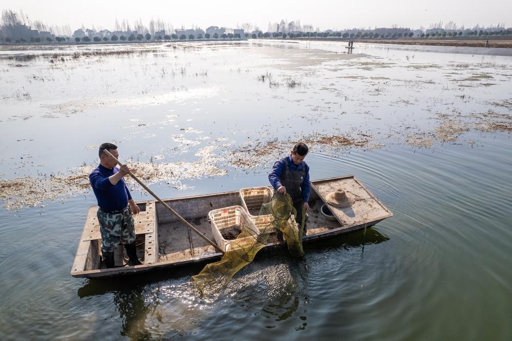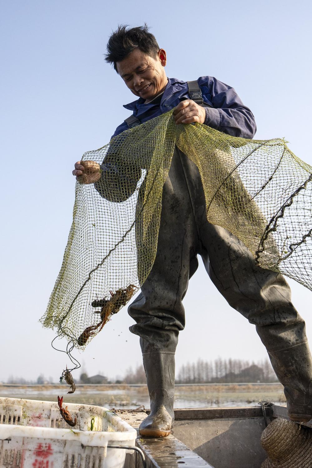 1月14日,虾农在湖南省益阳市南县南洲镇班嘴村琴湖农业深水虾养殖基地收获小龙虾。
