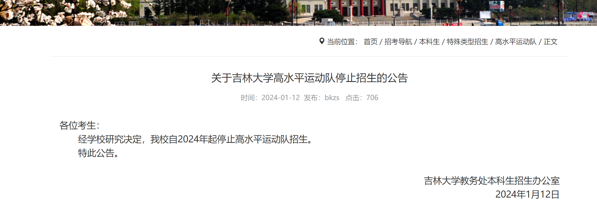 2024年1月12日,吉林大学招生网发布公告称,“经学校研究决定,我校自2024年起停止高水平运动队招生。”该公告落款署名单位为吉林大学教务处本科生招生办公室。