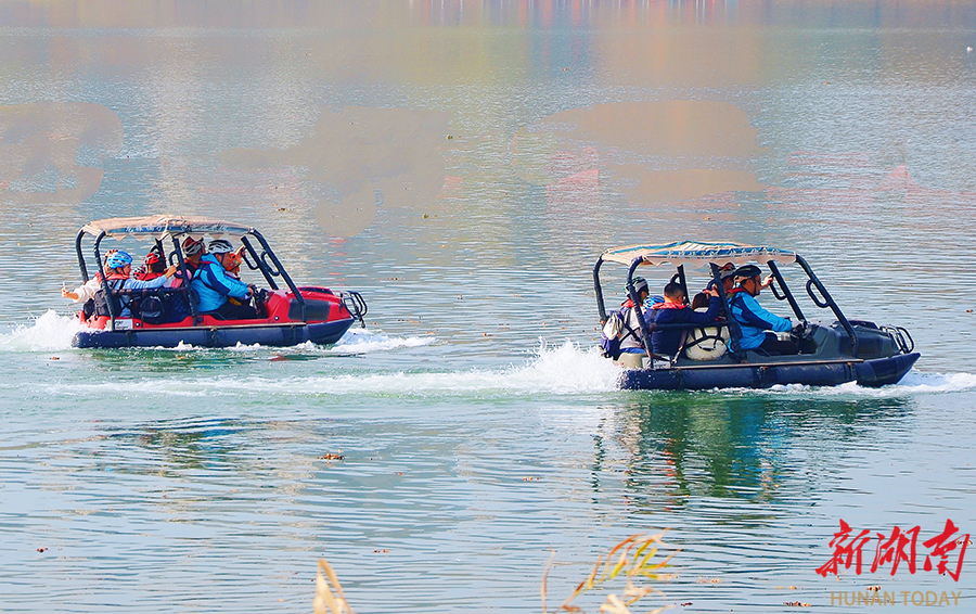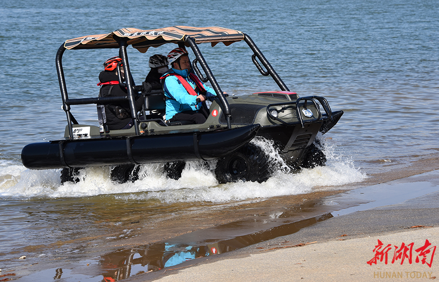 1月14日,长沙橘子洲沙滩公园,游客在驾乘新款水陆两栖车。日前,该园新购置8台“迷彩战士”、“铁血精英”水陆两栖车,为游客带来不一样的冒险体验。湖南日报全媒体记者 徐行 通讯员 吴靓 摄影报道