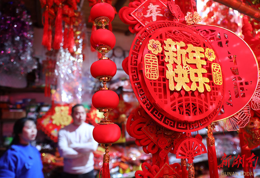 1月15日,顾客在道县商贸城一家商店选购新年喜庆饰品。 春节临近,人们忙着购年货、写春联,红红火火迎春节。 何红福 摄