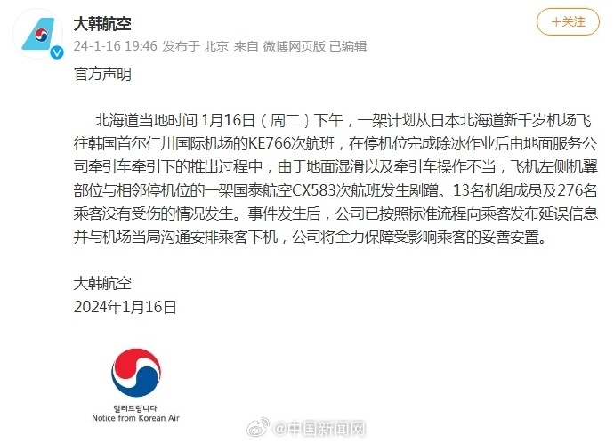 大韩航空发布微博称,北海道当地时间 1月16日(周二)下午,一架计划从日本北海道新千岁机场飞往韩国首尔仁川国际机场的KE766次航班,在停机位完成除冰作业后由地面服务公司牵引车牵引下的推出过程中,由于地面湿滑以及牵引车操作不当,飞机左侧机翼部位与相邻停机位的一架国泰航空CX583次航班发生剐蹭。13名机组成员及276名乘客没有受伤的情况发生。