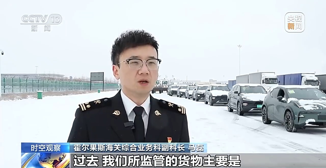 霍尔果斯海关综合业务科副科长 马磊:过去我们所监管的货物主要是单一的百货、服装、能源资源性商品。在2019年以前,霍尔果斯口岸全部都是汽车进口,如今我们口岸验放出口的新能源汽车数量已占全疆一半以上。