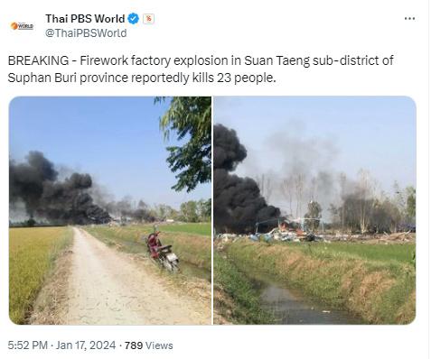 另据泰国公共广播服务公司下属新闻网站“Thai PBS World”社交媒体账号消息,当地时间17日,泰国中部素攀武里府一家烟花厂爆炸,目前已造成23人死亡,多人受伤。
