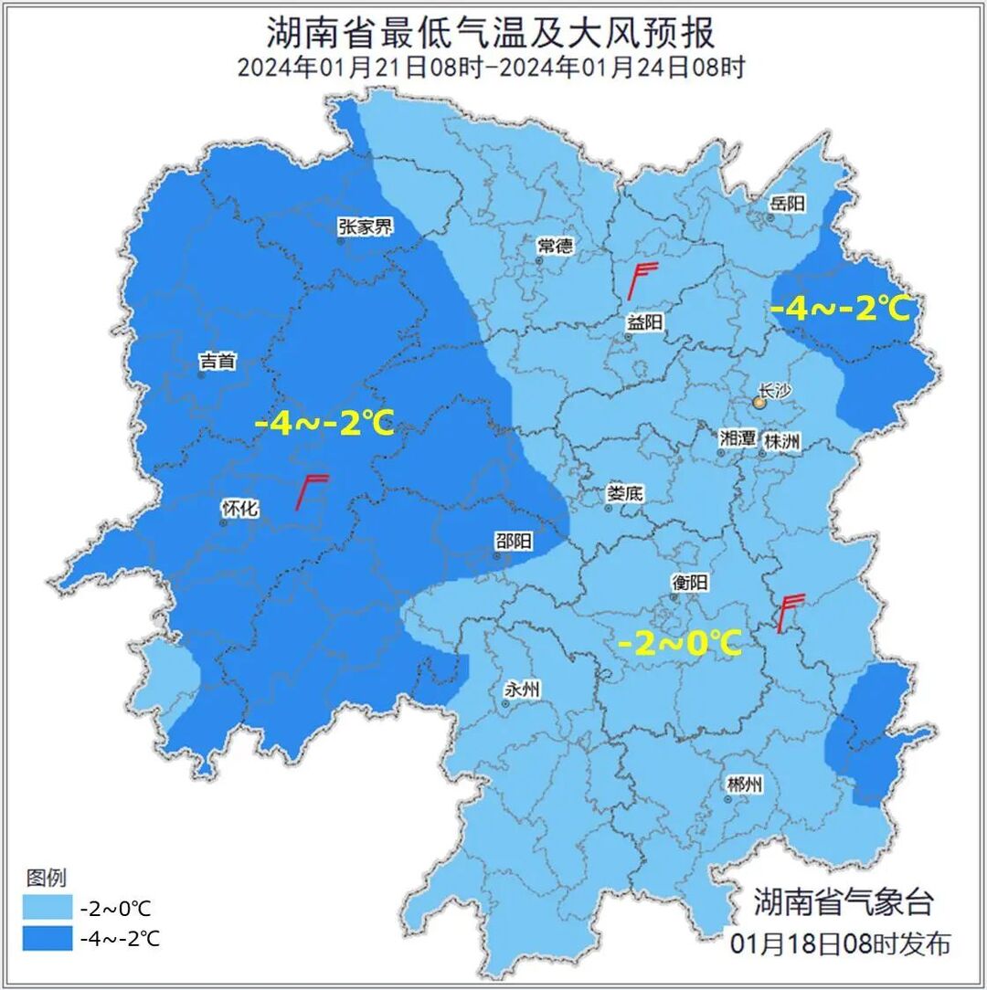 湖南省1月21日08时至24日08时最低气温及大风预报图