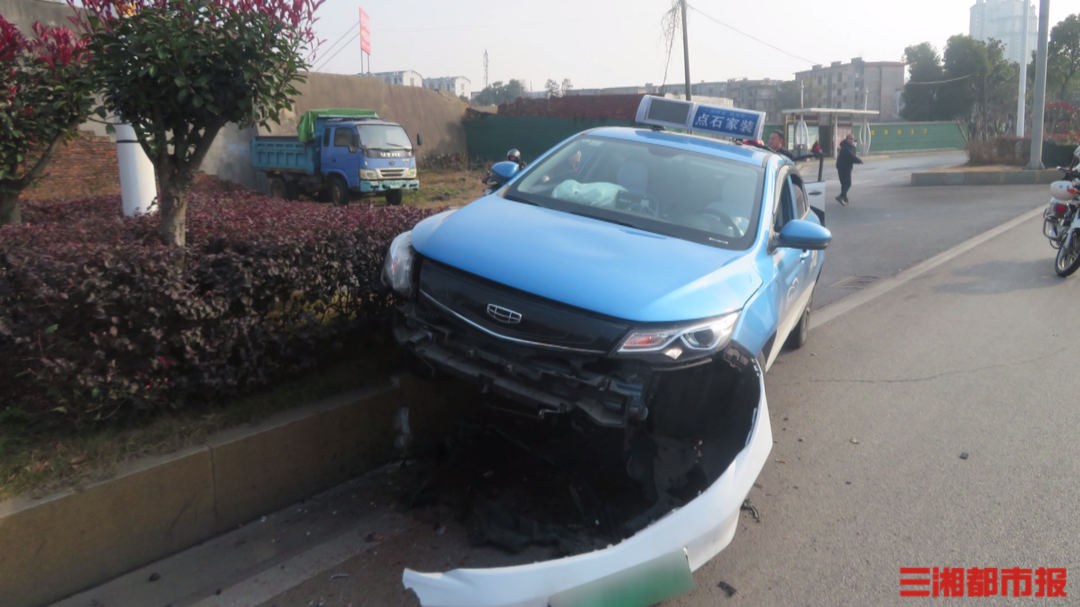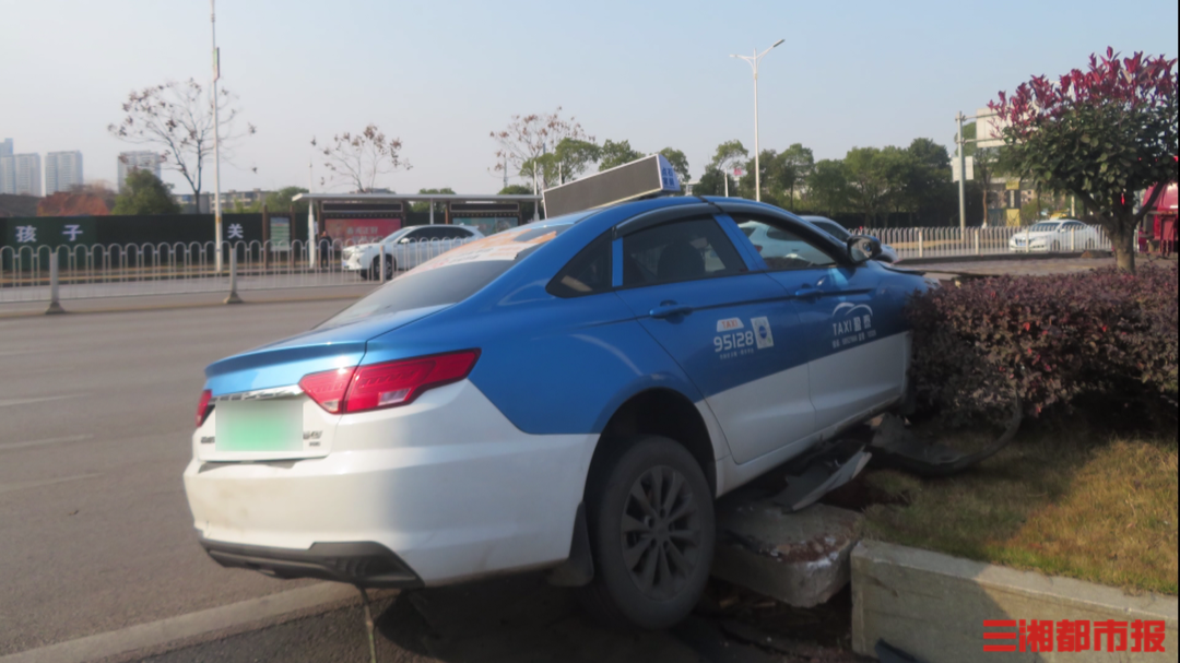 1月11日14时10分,湘潭市城区芙蓉大道鹏和加油站入口处,公共场所视频显示,画面中来车方向,一辆出租车沿右边第一条车道行驶至加油站入口处,相邻车道上一辆小车突然变道。出租车向右避让,却突然加速前冲,一头撞上绿化带,半个车身骑在绿化带上。
