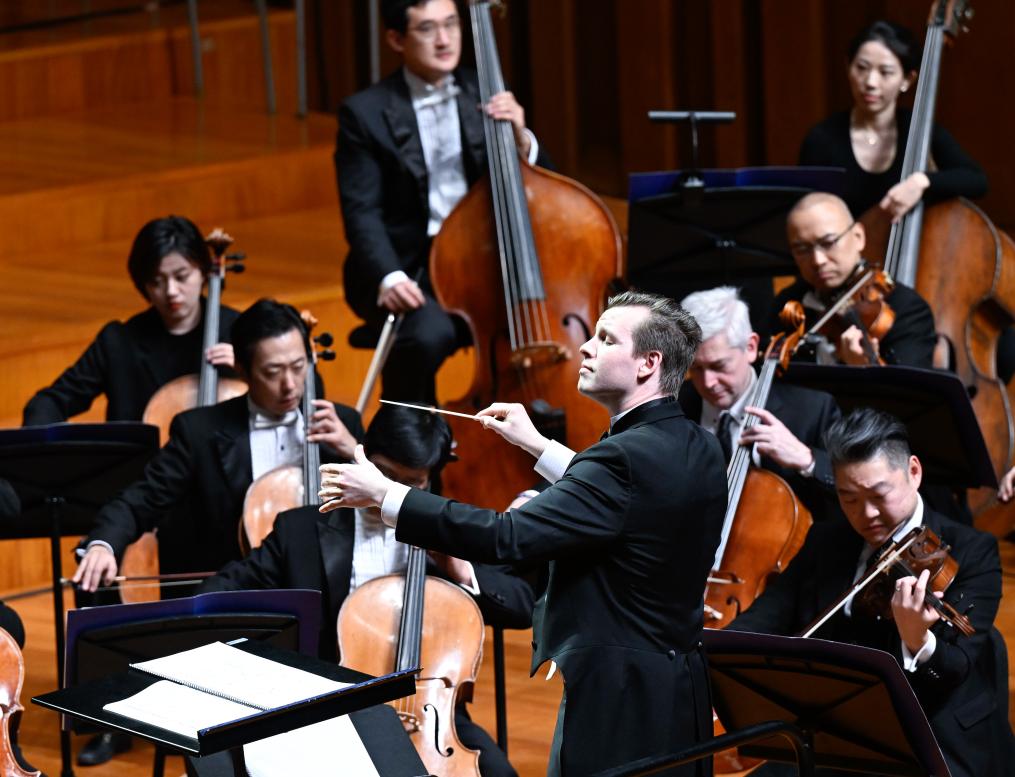 1月12日,在美国费城,中国指挥家余隆(中)在2024年费城交响乐团新春音乐会上指挥。