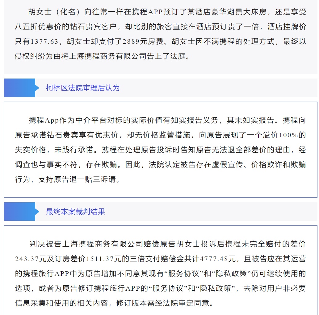 “大数据杀熟第一案”中,胡某某通过某OTA订购了一家酒店的豪华湖景大床房,结果所支付的价款高于酒店实际挂牌价一倍多。最后二审法院支持了其退一赔三的诉求。这样的处罚很难阻止平台大数据“杀熟”的冲动。