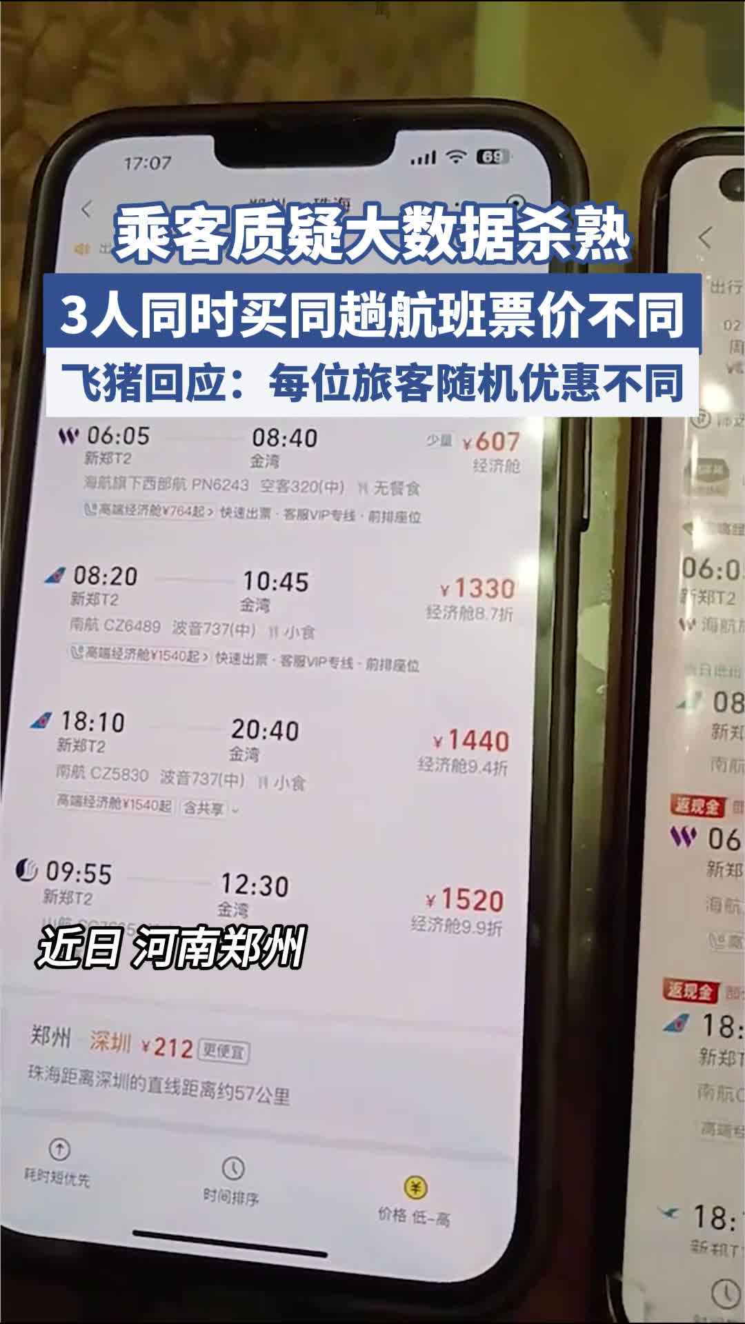 该网友称,其预订的2月7日由河南郑州飞往广东珠海的航班CZ6489,三个不同手机、不同账号搜索该航班显示出不同价格:400元、480元和1330元,差异显著。
