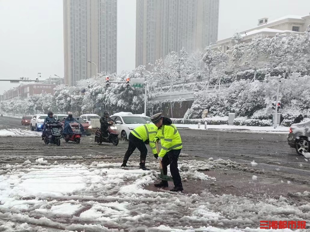 (长沙县交警组织警力对路口人行道积雪进行清理,确保行人出行安全。)
