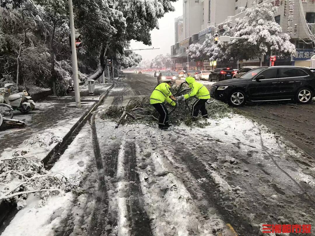 (长沙银盆路四水厂路段,积雪压垮的树枝严重影响交通,民警徒手清理树枝,确保交通畅通安全。)