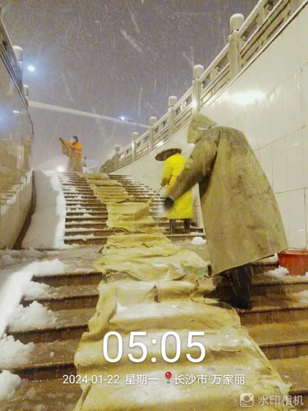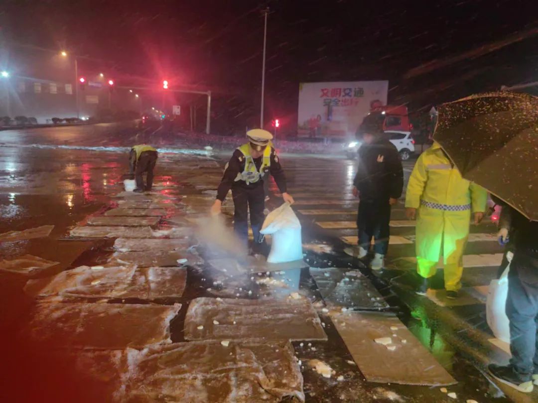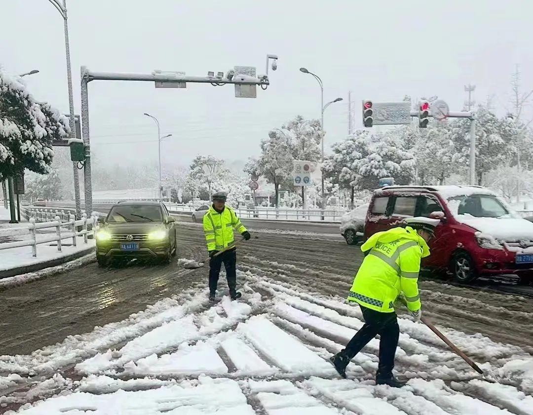 长沙县交警组织警力对路口人行道积雪进行清理,确保行人出行安全。