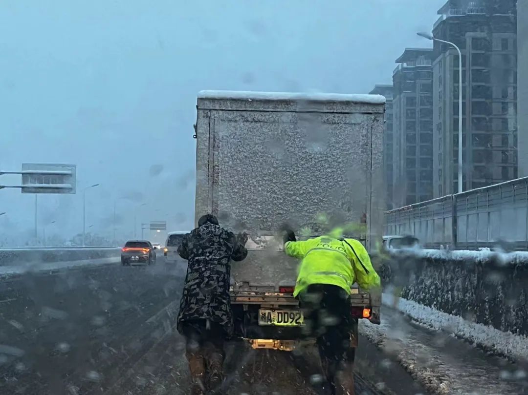枫林路、麓山路、新民路多处树枝被雪压断,交警在现场清理。早上6点,西二环岳麓大道东往北因积雪导致大货车通行受阻,岳麓交警五中队在现场疏导交通。