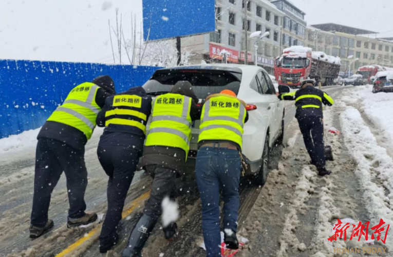 (新化县公路建设养护中心对管养的国省干线公路进行除雪作业)