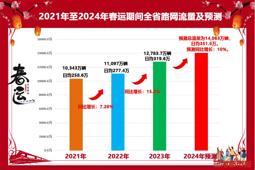 2024年春运将于1月26日开始,3月5日结束,共计40天。根据交通运输部《关于优化2024年春节假期收费公路免收小型客车通行费时段的通知》,2024年春节假期小型客车免费通行时段起止时间为2月9日(除夕)00:00至2月17日(正月初八)24:00,共计9天。春运期间返乡流、探亲流、务工流、学生流、旅游流、货运流等高位叠加,预测今年春运高速公路路网车流总量可能出现较大幅度增长。路网运行呈现“持续走高,集中返程、后期发散、潮汐明显”特征,路网及服务区运行压力大。根据气象部门预测,春运期间我省气温与常年相比偏高,降水偏多,雾霾天气偏多,冷暖波动大,出现大范围低温雨雪冰冻天气的可能性较小,但仍须警惕阶段性及局部山区路段低温冰冻天气过程对交通出行的不利影响。